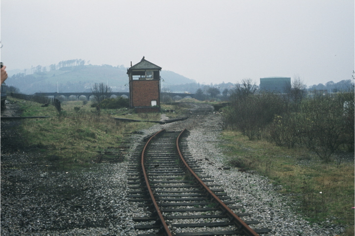 The sad remains of Panteg and Coedygric signal box. It had closed only six months earlier. The train is on ‘Mon bank’ a steep portion of the old Monmouthshire Railway & Canal Company’s (the ‘Rat & Cat’s’) line south of Cwmynyscoy Viaduct and Skew Bridge which crossed the Mon and Brec Canal. Just beyond this point the line converged with the old Newport Abergavenny and Hereford Railway. The stone wall to the left of the box is the parapet of a very short tunnel that permitted the Taff Vale Extension Extension (sic!) to gain access to the Pontypool Caerleon and Newport, whilst to the right can be seen a small part of Panteg Steelworks. |