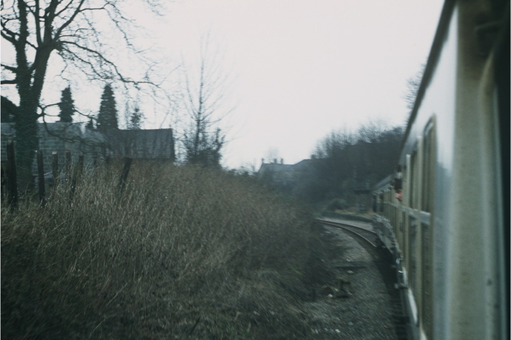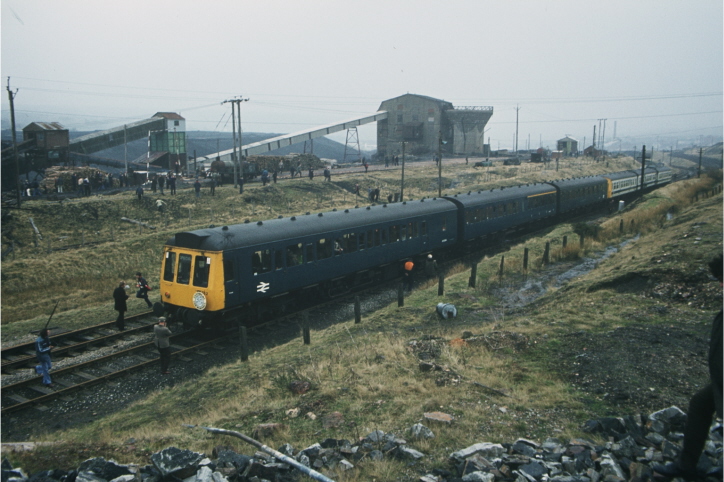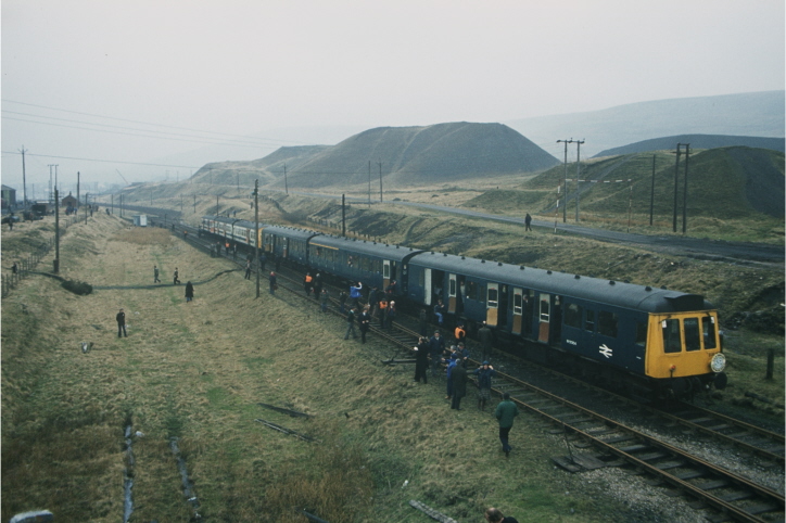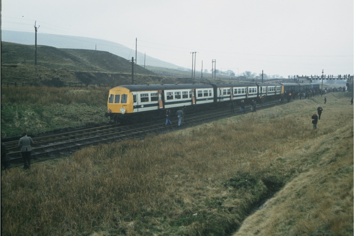 The train comes to rest at the exchange sidings, which are just below the current level crossing at Furnace Sidings. The set nearest the camera is Met-Camm Class 101, set no. B803, whilst the far set is a BRCW Class 118, set no. B462. The far car, 51304, suffered the indignity of being the first Class 118 car to be scrapped. The end came in 1985. Beyond the train is a footbridge – the abutments, now truncated, remain, just south of the level crossing, which was laid in some years later. How useful this bridge would be today! Note the lack of vegetation, largely kept in check by large numbers of foraging sheep |
