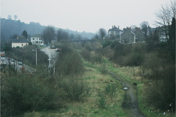 This view, to the south east, was taken from the train as it passed over the bridge at Trosnant Junction. The meandering path was once the bed of the Taff Vale Extension of the Vale of Neath line. Pontypool (Clarence Street) station occupied this area up as far as the footbridge in the distance, but the line was closed in June 1964. The area is now completely covered by the A472 dual carriageway, the successor to the road on the extreme left, which still functions as a local route. As for the bridge on which the train is standing, this has now been replaced by a slender modern structure which permits pupils of West Mon Comprehensive to make their way to and from school without tangling with the ceaseless road traffic |