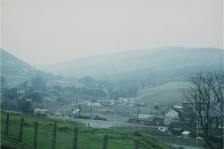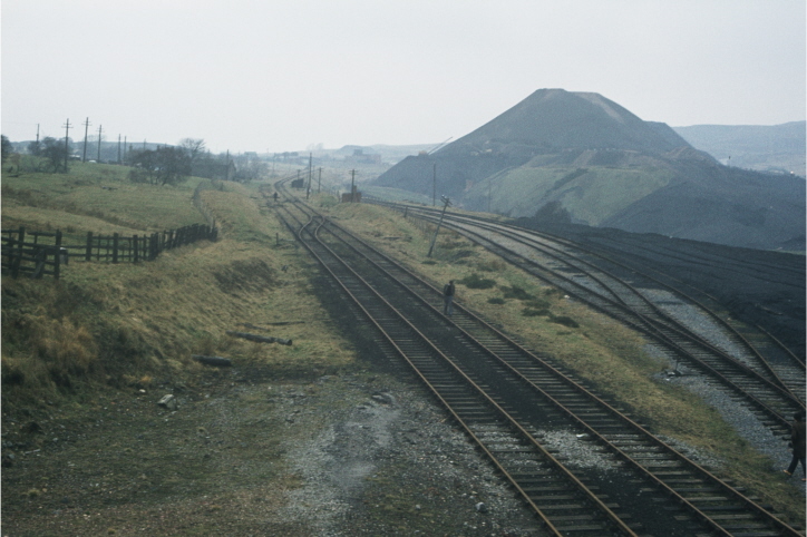 A view looking south east down the train towards the rail over rail bridge, from the bridge seen earlier. On the extreme left, a corner of the bottom shed is just peeping into the scene. The brick hut to its right has now gone. The foreground area to the left of the train is now largely occupied by the ‘deviation’ - the line by which stock leaves our yard for the main line. The biggest slag heap is Coity Tip. The road coming in from the right is the link road to Big Pit – this was once a railway line. Just beyond the last coach of the train can be seen the western outside sidings which were lifted in the mid-eighties – perhaps we will see them relaid one day. |