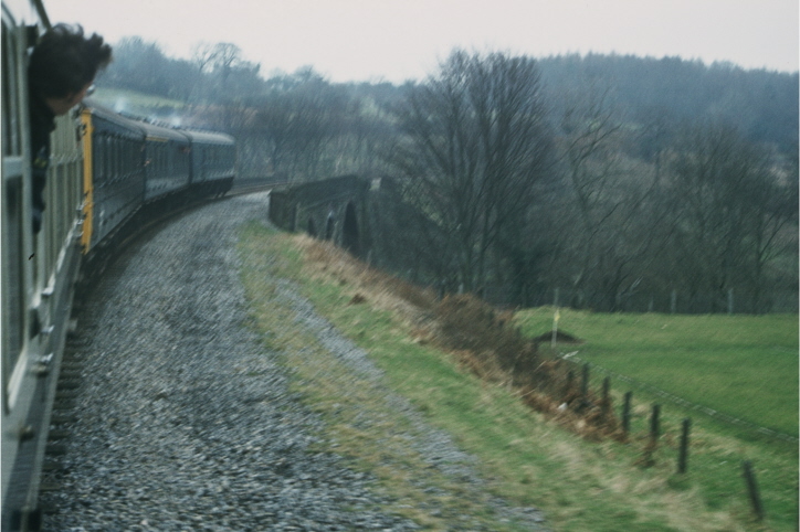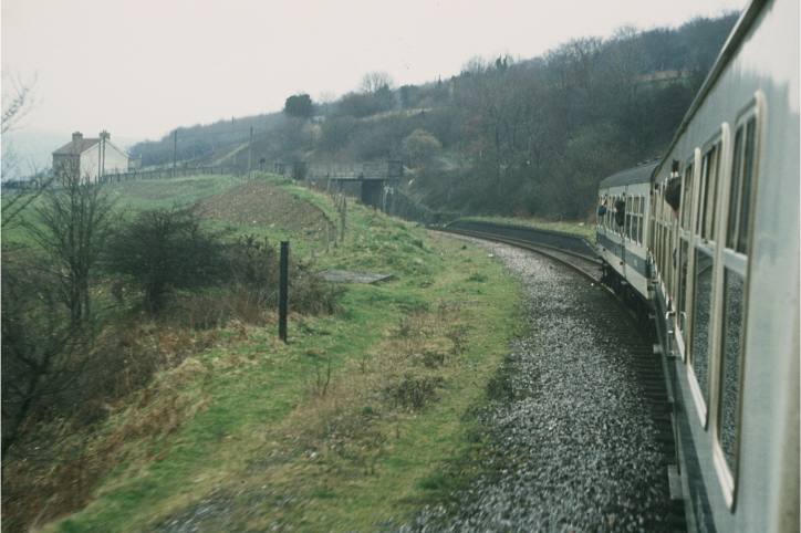 Heads out of train windows normally look in the direction of travel – if for no other reason than to avoid losing it on an otherwise unseen bridge parapet! This view is therefore on the return journey, going down, and facing south east. The train is about to enter the remains of Cwmffrwdoer Halt. The road overbridge carrries the road to Plasycoed and Pantygasseg, which is to the right and up a long steep hill. The line here was once double track, but was singled in June 1965. The halt, along with all others on the line was opened in 1928, but closed, doubtless due to the exigencies of war, on 5 May 1941 |