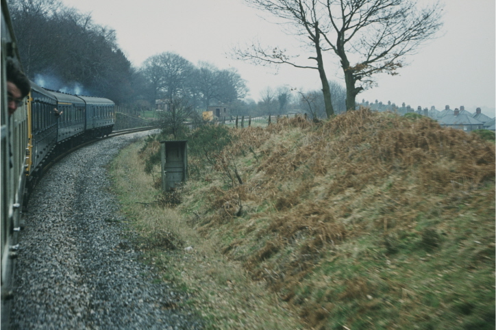 The exhausts continue to rasp as the train continues its journey towards Pentrepiod Halt, having almost completed the 270 degree bend of the horseshoe. The brick hut in the distance still stands, though there is now no sign of the hut in the foreground. The houses on the right belong to a small estate of houses built by the local authority called Waunddu. |