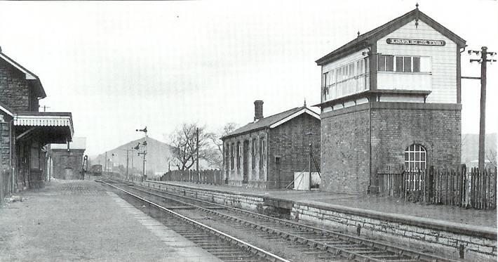 station building, with a water tower at the far end of the platform. Behind that is the goods shed. There was also a loco shed here. On the right is the recently rebuilt platform