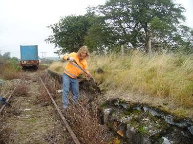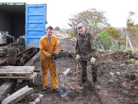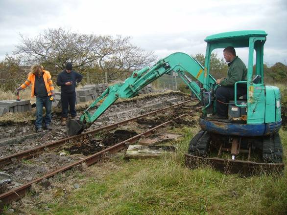 moments by relieving the track (soon to be replaced) of its tree stumps. Dave Perham is on the minidigger with Ryan