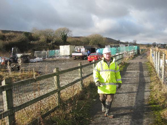The immediate requirement for any job of this size, is that the requirements of the workforce are satisfied, and here a sizeable collection of portacabins and the wherewithal to support it has appeared almost overnight. Here we look north, with Blaenavon (High Level) station to the right of the fence and private land to the left. It is fortunate that such land just happened to be there, otherwise life would have been difficult. Foreman Bob of Griffiths who oversaw the installation of Bridges 13 and 14 with casual ease, born of years of experience strides purposefully towards the camera. 7883 – 11 Jan 2011 |