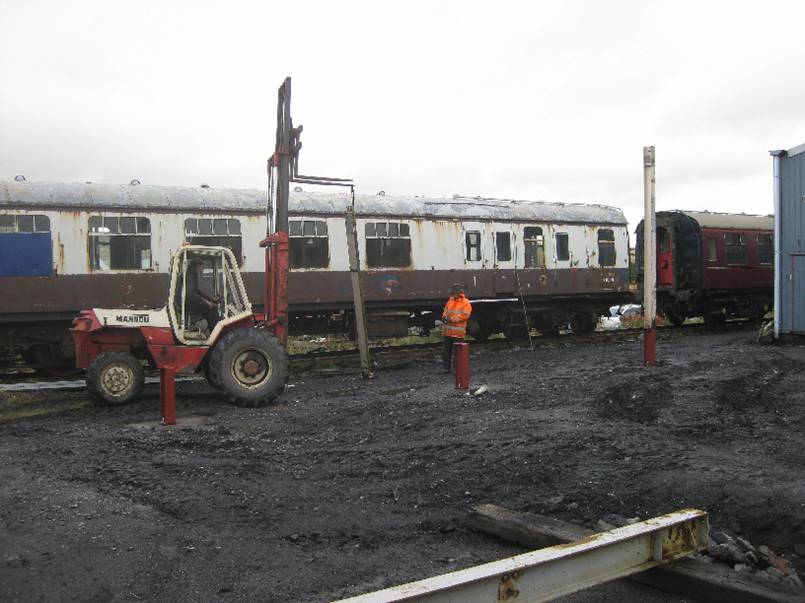 is seen been lifted into place using the Manitou all-terrain fork truck. In the back ground lies BR Mark 1 BCK No21034. This vehicle has seen some work, but has